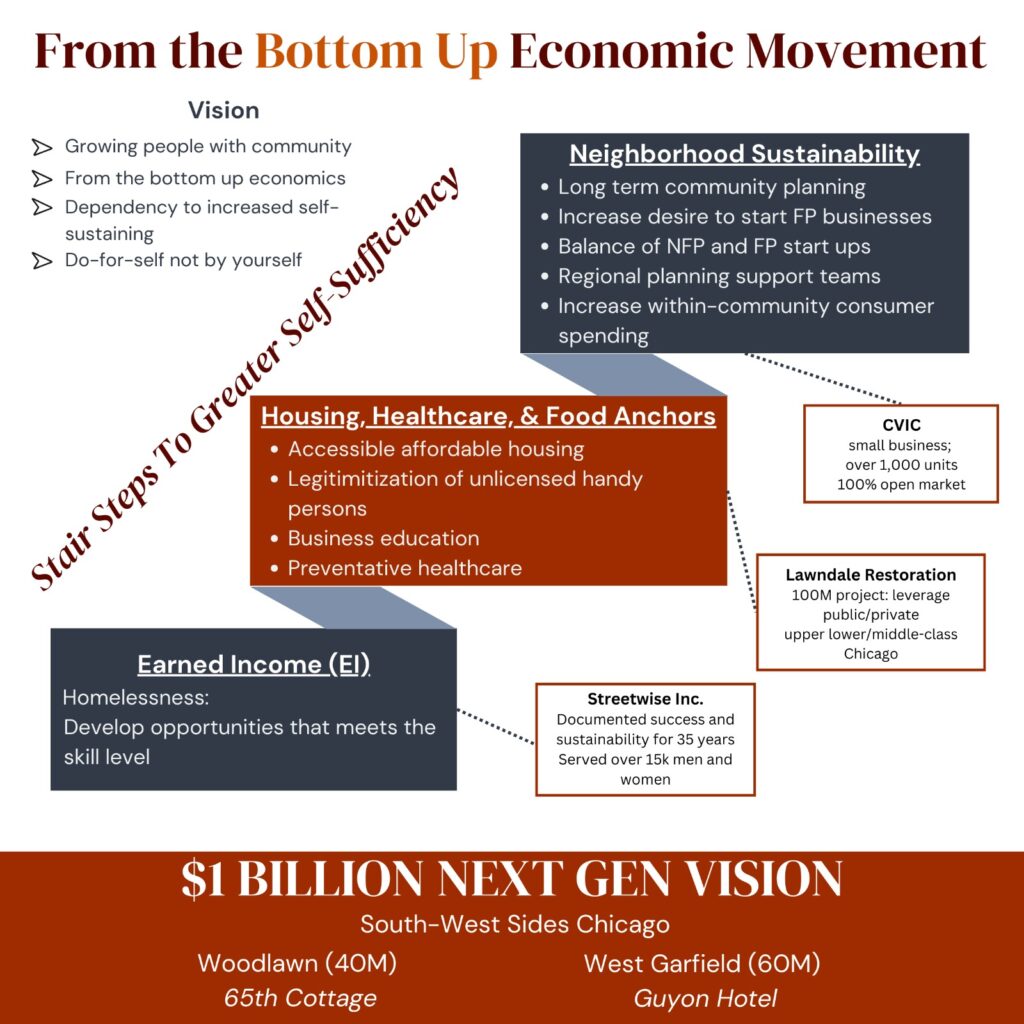 Martin inspired my dreams, while Danny helped me focus my efforts. Malcolm instilled perseverance, and Obama motivated me with the words, “Yes, we can!” Bene’ DeBerry-Spence, Pamela McElvane, and a host of Chicago’s volunteers selflessly mentored this passionate Streetwise kid. This isn’t just my vision; it’s an initiative called “Stairsteps to Greater Self-Reliance,” aimed at uplifting the least among us. CVIC is launching a new development, Lifestyle on the Grove, an 81-unit mixed-use project located at 6501-6543 South Cottage Grove. Once again, CVIC is ready to make a significant impact on Chicago, reinforcing the social fabric of Woodlawn.